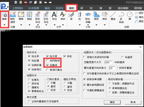 这种况属于个别模型进入施工图时,一些图素开关未打开造成,需要到模板-参数构件显示菜单下勾选打开即可(如下图5)。