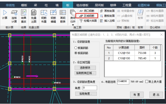 操作步骤是必须先要执行【计算】、然后再执行【区域钢筋】命令,按照对话框中1设钢筋信息、2设区域范围、3设钢筋放置角度、4布筋选用四个步骤布置。命令行提示选择区域内楼板,在选择的过程中会有动态的选择结果粉红色显示如下图,动态提示选择布置钢筋的位置,确定钢筋位置后,绿色线条绘制钢筋范围。