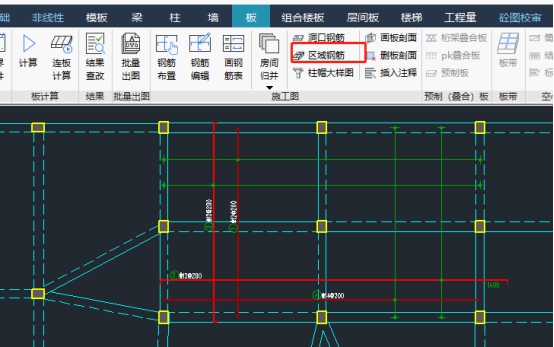 A:在绘制楼板施工图时,当需要在某一区域布置双层双向通长钢筋时,可用“区域布筋”的功能绘制,区域布筋支持“板面钢筋”和“板底钢筋”的绘制。选取所需板块,程序会统计出所选板块的配筋信息,供用户选择要布置得钢筋规格(也可交互输入)、或者可选择按区域的最大值配筋量布置。