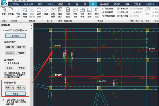 执行【钢筋布置】命令后,在弹出的对话框中,执行【补强钢筋布置】,对配筋面积不足的支座或板底实现自动补强。对于不需要布置补强钢筋的楼板支座等位置,程序也会绘制钢筋并用6@999的表示来提示用户。
