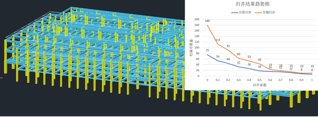 与其他软件不同,V2柱图不需要设置基准值、差值或百分比这种限制因素,归并算法根据设计师的归并习惯内置了多种筛选项进行综合考虑。归并算法的实战效果如何呢?让我们看看下面这个案例,该项目为框架结构,抗震设防烈度为7度0.15g,砼框架抗震等级为二级。以首层为例,共有180根柱子。分层归并和全楼归并下各归并系数对应生成的柱编号数量见下表。归并结果的分布非常均匀,不会出现严重的断层现象。相信不论是哪种条件下的项目,都能找到最经济且合理的选筋方案。