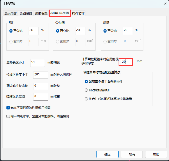 第一,计算墙柱体积配箍率时取用的保护层厚度在剪力墙施工图的参数中可以设置,如下图所示,默认值为20mm。发来的数据中从剪力墙施工图看该值为默认,校核的工具箱参数中设定的保护层厚度为15mm。