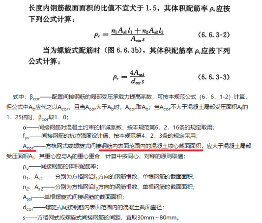第二,按现行混凝土规范的要求,核心区域面积应取钢筋内表面范围内的混凝土面积。所以不应该只是扣除2c,应该是扣除2*(c+dg),其中c为混凝土保护层厚度,dg为箍筋直径。