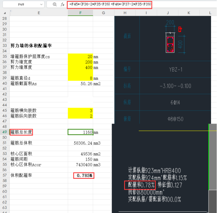 ρ=50.26*1160/7430400≈0.7846% 和墙柱实配数量中查到的体积配箍率基本一致。