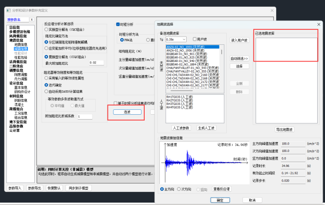 这是因为在计算这个工程的时候,选择了进行时程分析,但是没有选地震波导致的,在如图二所示的界面选择上地震波以后就没有问题了。这也是随着减震工程越来越多,很多设计人员容易忽略的问题。