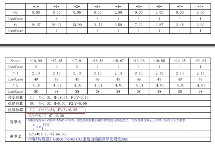 在satwe计算结果输出中,钢梁截面Hw200x200x8x12,Q345的抗剪验算给出了荷载与承载力的比值,反算出抗剪承载力为20.84/0.08=260.5kN。但根据规范抗剪验算的工时,代入其截面的Ix,Sx,得到的最大剪力为252kN,按其腹板横截面直接乘以抗剪强度得到的抗剪承载力为(200-2x12)x8x175=246kN,都比软件计算的小,Ix =4720cm4, Sx =262.74cm3,fv=175N/mm2,按这式7.5.1-1钢梁截面抗剪承载力252kN,按7.1.5-2计算的是246kN,都比软件输出反算的小。