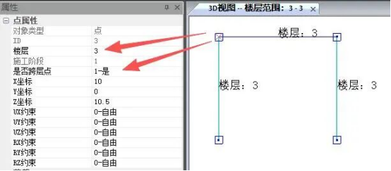 如果想要统计整个穿层柱的构件位移角(不是按分段方式),并将其统计到第3层,需对穿层柱进行构件层号和节点层号修改,具体如下图: