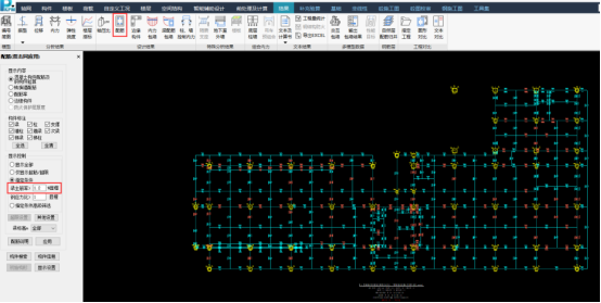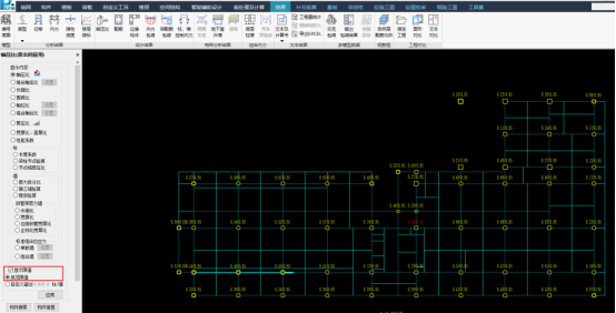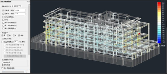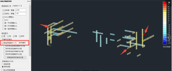 以20作为界限进行筛选,可以看到构件数量大幅减少,此时将偏红色的3根构件截面加高150,加宽100,偏蓝色的构件截面不变。得到的位移比为1.48,小于1.5,满足规范要求。