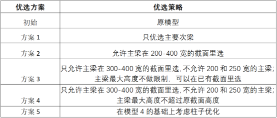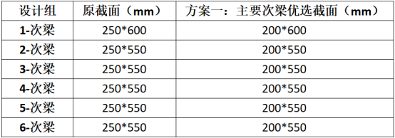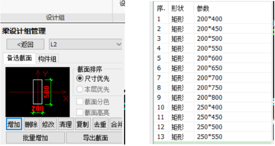 本工程中次梁配筋率多分布在1.1%以下,还可考虑进一步提高配筋率,减小梁高,提高使用空间,同时关注设计组的材料用量情况。因此创建设计组的备选截面可有规律的逐步减小截面尺寸,每个设计组的优选截面库相同,如下图。