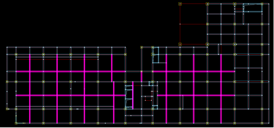各楼层梁设计结果,主梁配筋率主要分布在1.2%以上区间,次梁配筋率主要分布在1.2%以下区间,除楼层中局部短梁出现剪扭验算超限外,无其余梁构件设计超限,如下图以第2层配筋简图为例,筛选出配筋率大于1.1%的梁分布情况。