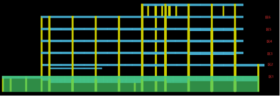 各楼层次梁主要采用250mm*550mm截面,将其作为截面优选对象,在平面内只划分为一个组:次梁。立面上,每一层作为一个区,第七层为小屋面及构架,不作处理。以第2层平面为例,如下图。