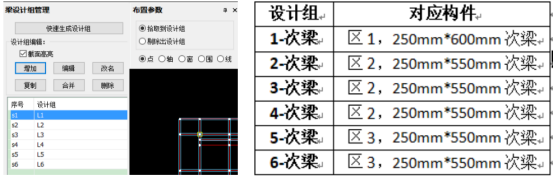 通过【增加】命令,创建六个设计组,每一层的次梁对应一个设计组,分别将各层截面为250mm*550mm的次梁添加至相应的设计组内,各设计组对应构件如下所示。