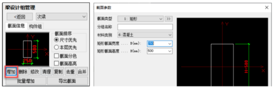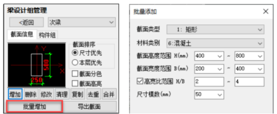 同属于一个设计组内的所有构件,采用同一种优选方式,共用一套备选截面库。因此,每个已创建设计组均需要创建一套备选截面库,可通过【增加】或【批量增加】创建,前者等同于新建截面,后者按照截面尺寸范围、控制条件和模数自动批量创建。