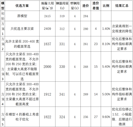 (2)通过五种方案的对比,一般而言优化构件越多,备选截面范围越大,优化力度越大。