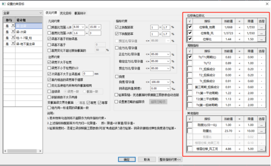 PKPM结构软件2026版开始,AID升级到2.0,该版本支持同时进行截面优选与指标控制,可在截面优选时勾上位移比等指标做为约束条件,这样在优选截面的同时,会使结构指标也满足要求。软件设置与结果如下: