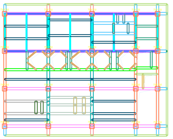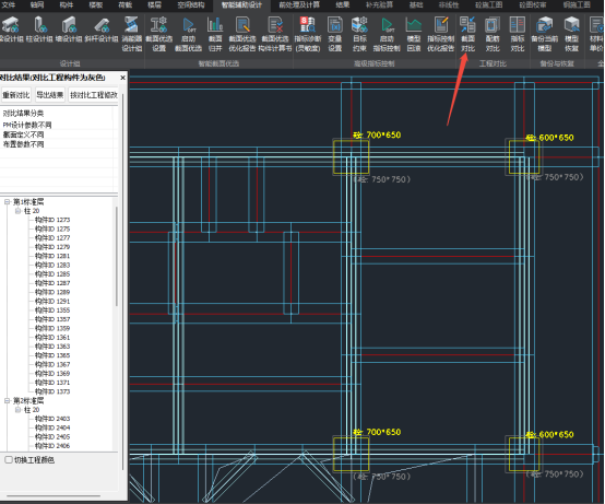 1)构件设计组的划分。本次考虑重点调整柱,考虑设计师提的柱截面种类尽量少,以及二三层收进一次的需求,将柱的设计柱分为6组,分别为一层左、中、右,二三层左、中、右,备选截面范围为600-750,分组以及备选截面设置见图五;