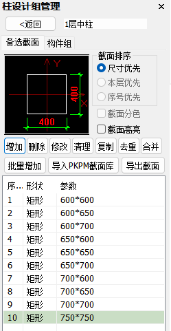 图五 柱构件设计分组、备选截面设置