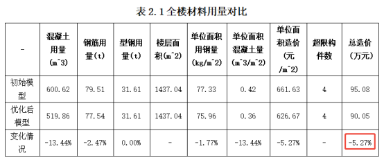 从对比结果可以看出,AID2.0用较短时间自动调整后的模型,全楼混凝土用量减少 13.44%、钢筋用量减少 2.47%、总造价降低 5.27%,且结构关键指标均满足国家规范要求,也满足了项目初始提出的限值要求。