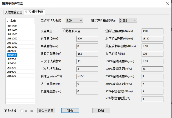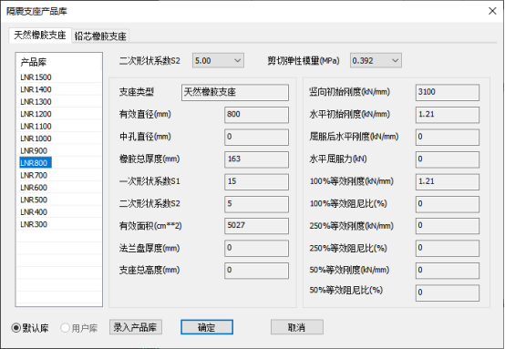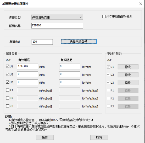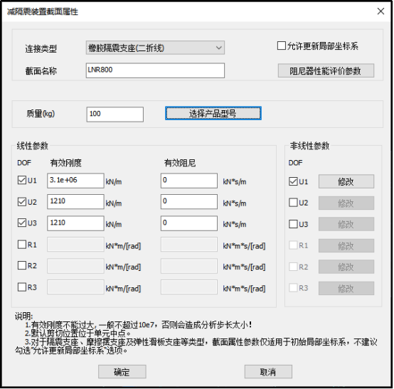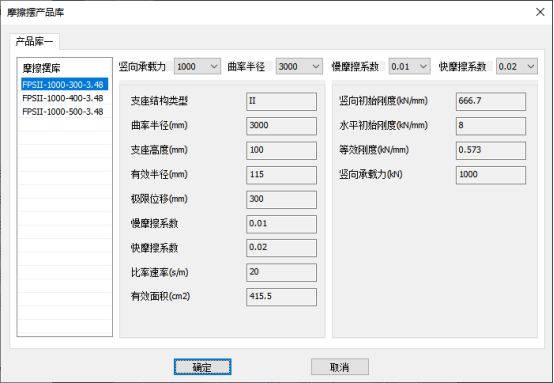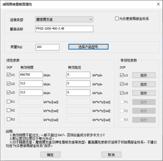 用户可以从程序自带的摩擦摆支座产品库(图11)中选择合适的型号进行建模。线性参数中包括U1、U2、U3三个方向的有效刚度和有效阻尼(图12)。线性参数用于竖向加载分析和模态分析,因而有效阻尼可以不输入。
