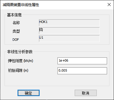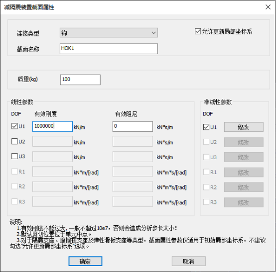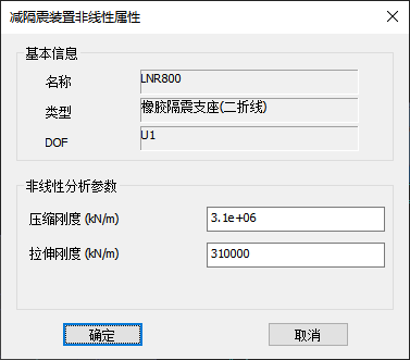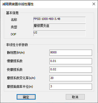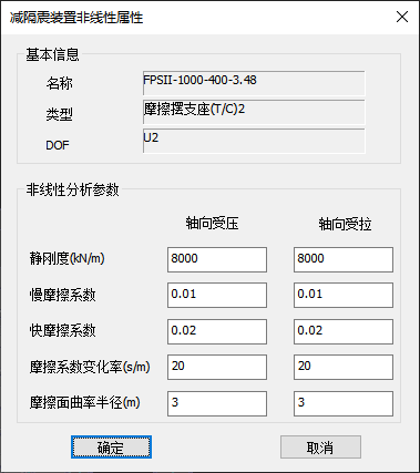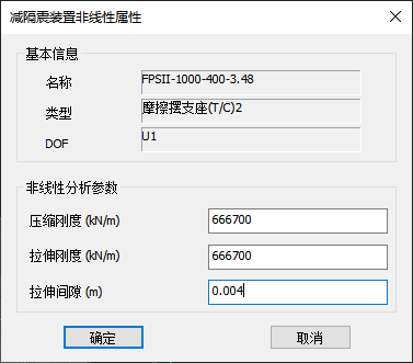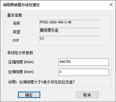 U1方向非线性参数中包含支座的抗压刚度和抗拉刚度。一般情况下,摩擦摆隔震支座不具备抗拉能力,因而拉伸刚度一般输入为0。如果地震作用下支座受拉,则摩擦摆支座将会被提离。如果此处输入拉伸刚度,则相当于在支座中增设了抗拉装置,受拉时抗拉装置发挥作用。