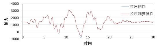 橡胶隔震支座的拉伸刚度与压缩刚度相比很小,一般是压缩刚度的1/5~1/10。如果不考虑橡胶隔震支座的拉压刚度异性,会高估隔震支座的抗拉刚度,从而放大隔震支座的拉应力(图4~图6)。