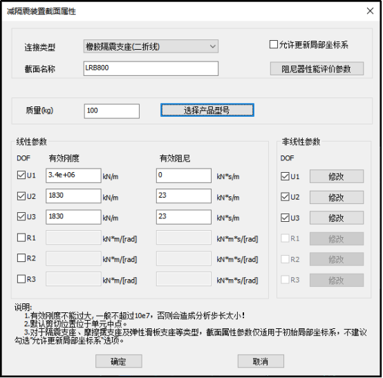如图3所示,对于天然橡胶隔震支座,仅需输入线性参数中的U1、U2和U3方向的有效刚度以及U1方向的非线性参数。U1、U2和U3为局部坐标系方向,可以通过点击下方工具按钮中的显示局部坐标系按钮后在视图窗口中查看。其中U1为竖直方向,U2和U3为水平剪切方向,一般U2对应整体坐标系X轴方向,U3对应整体坐标系Y轴方向。