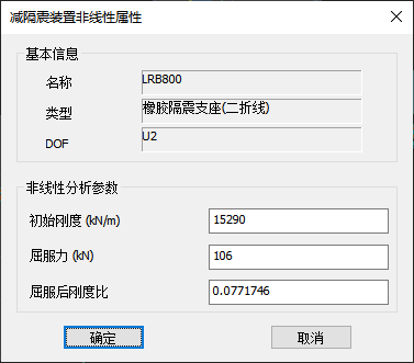 铅芯橡胶隔震支座除了要输入上述天然橡胶支座的相关参数以外,还需要输入U2和U3两个水平方向的非线性参数(图7),包括初始刚度、屈服力和屈服后刚度比,屈服力为剪力-位移曲线中二折线拐点所对应的内力。水平方向力学模型可以采用双折线模型和Wen模型,后者相较于前者滞回曲线更加圆滑饱满,总体上差异不大。
