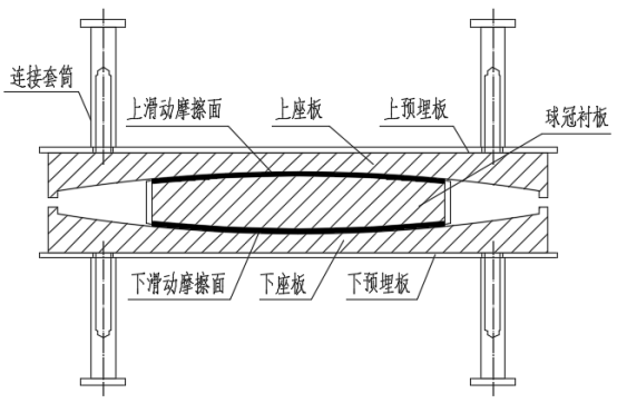 摩擦摆隔震支座(图10)是一种通过球面摆动来延长结构自振周期,并通过滑动界面摩擦来消耗地震能量以实现隔震功能的支座。与橡胶隔震支座相比,其具有承载能力高以及自复位能力强的优点。