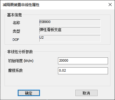 U2和U3方向的非线性参数一般包括静刚度、慢摩擦系数、快摩擦系数、摩擦系数变化率以及摩擦面曲率半径(图13)。后面四个参数一般可以按照厂家提供参数确定,静刚度与支座所承受的竖向荷载有关,可以通过如下公式计算得到。