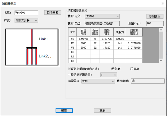 定义好隔震支座和抗拉装置以后,如果需要让二者并联,可以通过减震组中的“自定义并联”功能实现同一个位置建立隔震支座和抗拉装置两个单元(图18)。