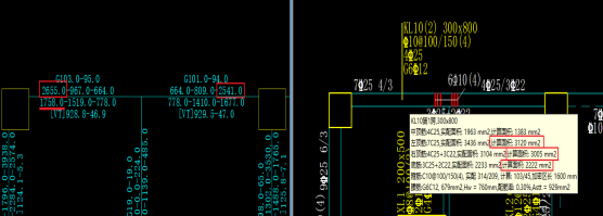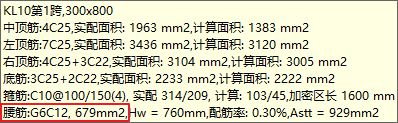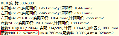 由图可见,梁腹板高Hw=760,按规范要求梁的腰筋间距不超过200,所以单侧至少需要3根钢筋,参数中默认的最小腰筋直径为12,所以自动生成6根12的腰筋,标注为G,表示构造腰筋。上、下纵向钢筋面积为: