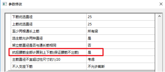 该参数默认选择为“是”,如果选择了“是”,程序直接将计算的抗扭纵筋面积均分到上、下纵筋面积中,腰筋按构造配置。